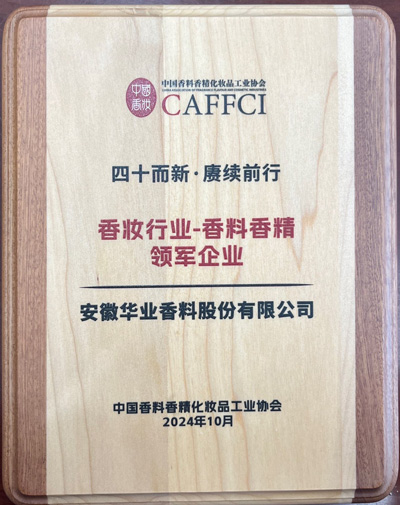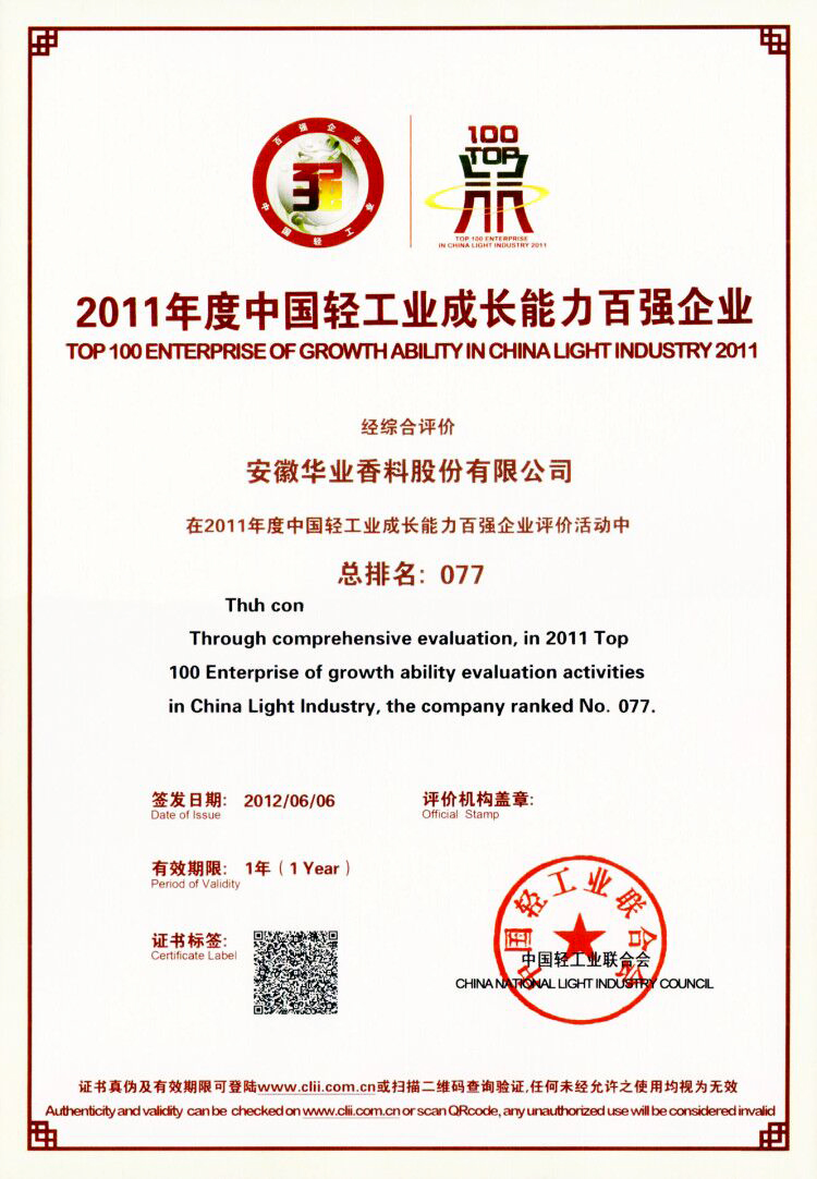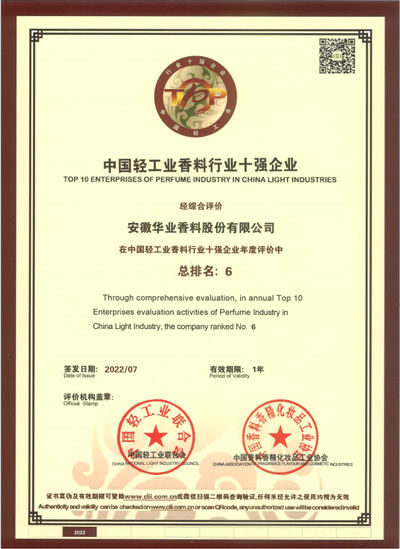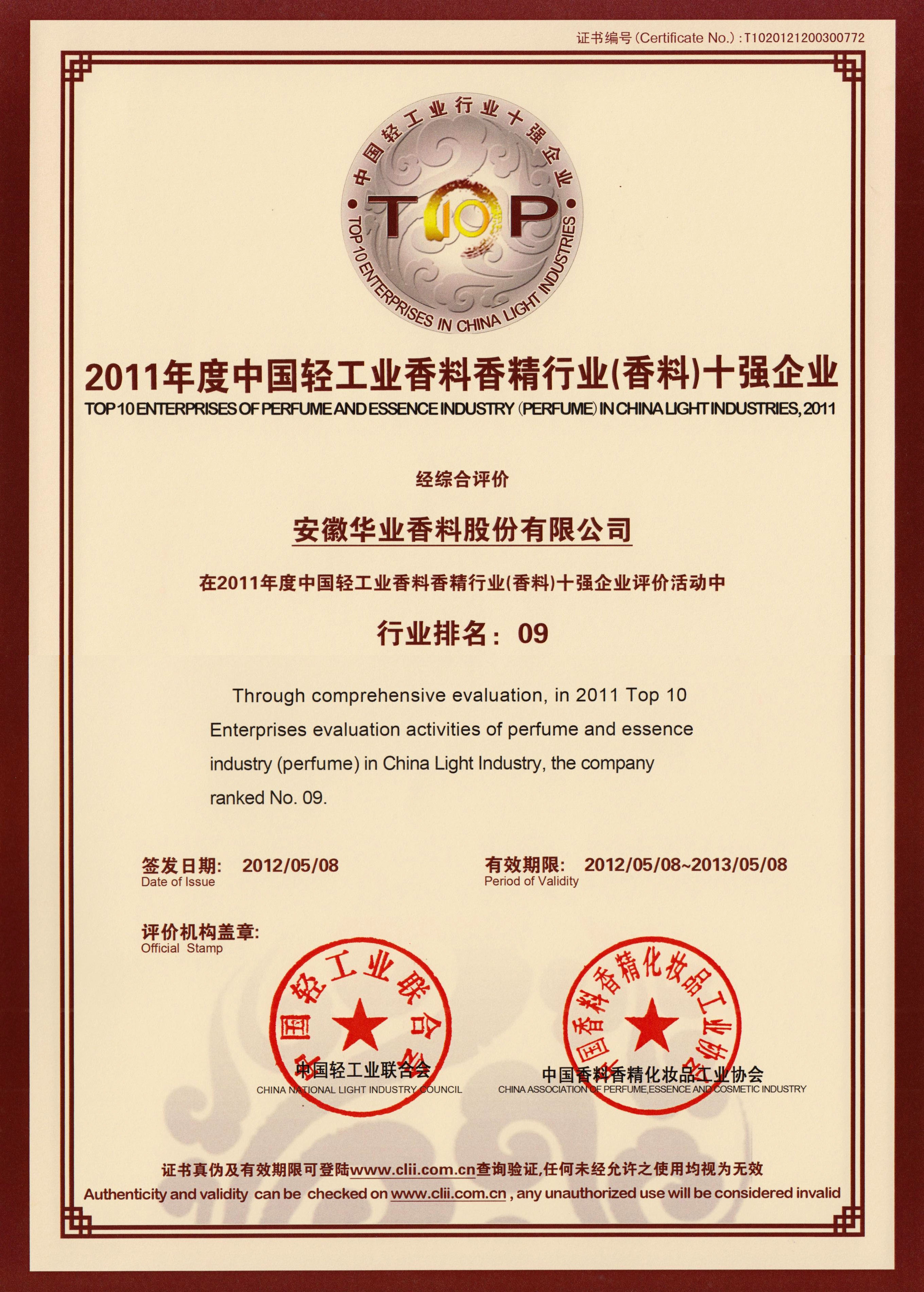 2011年榮獲中國輕工業香料香精行業(香料)十強企業