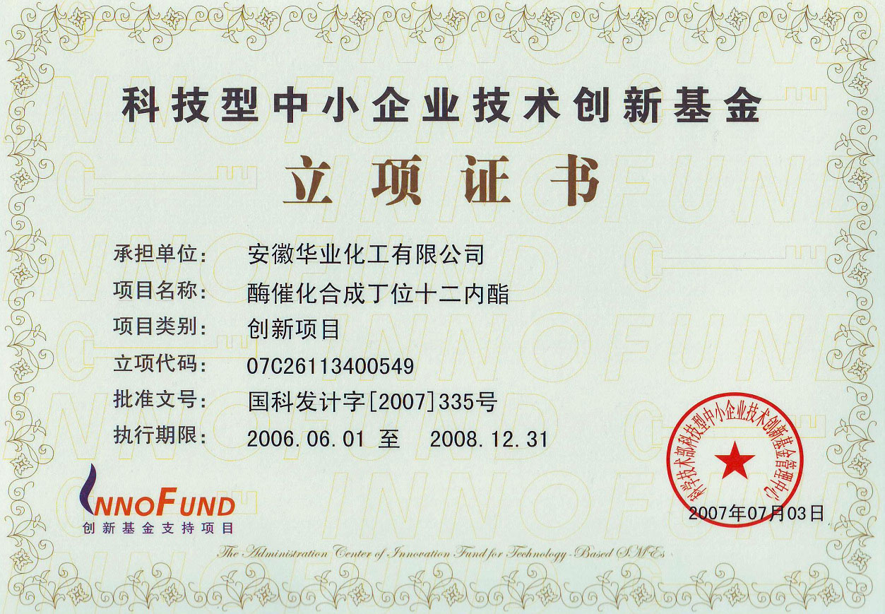 2006年”酶催化合成丁位十二內酯項目獲“科技型中小企業技術創新基金立項,列入安徽省”861“行動計劃項目