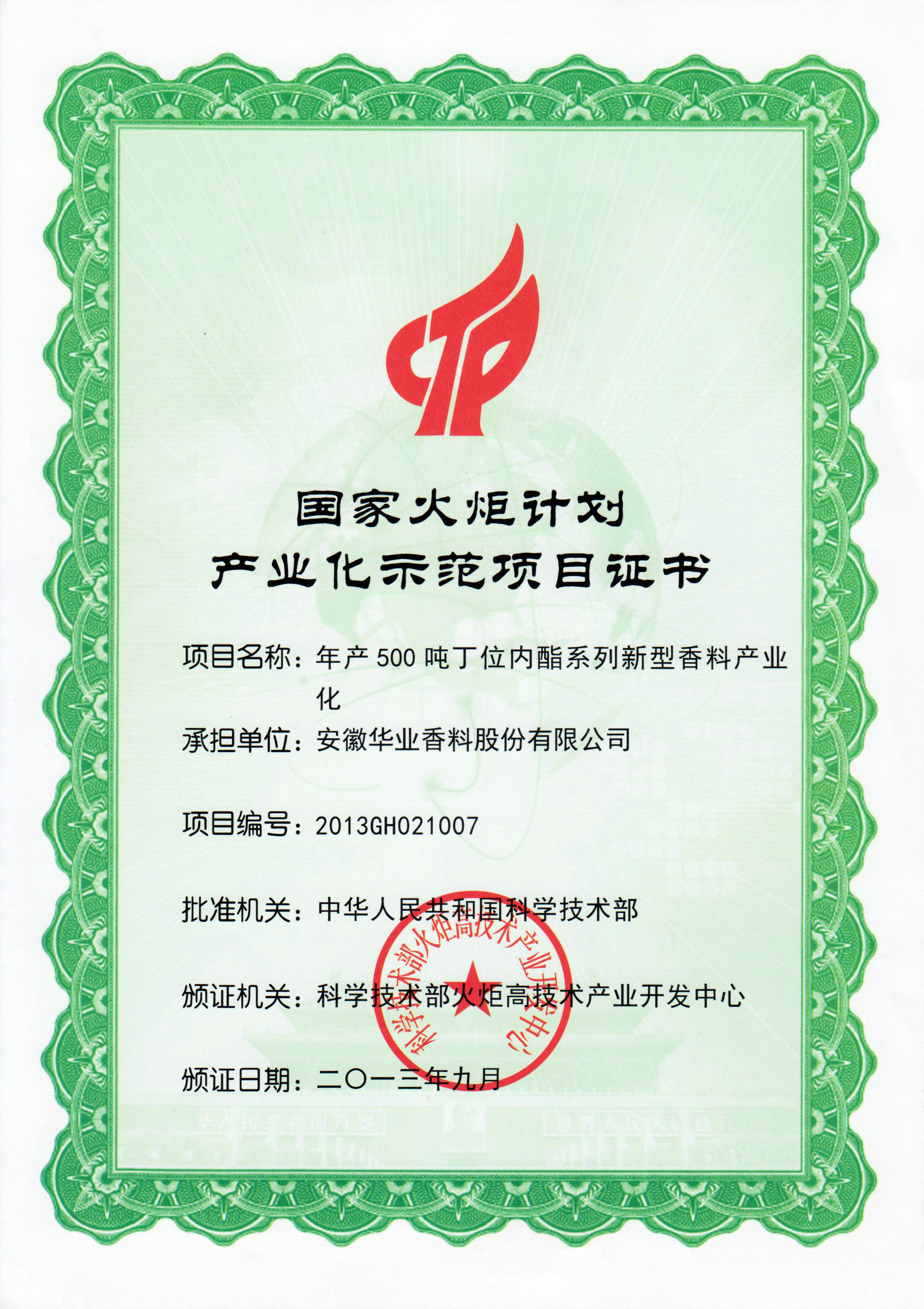 2013年丁位內酯項目被認定為國家火炬計劃產業化示范項目