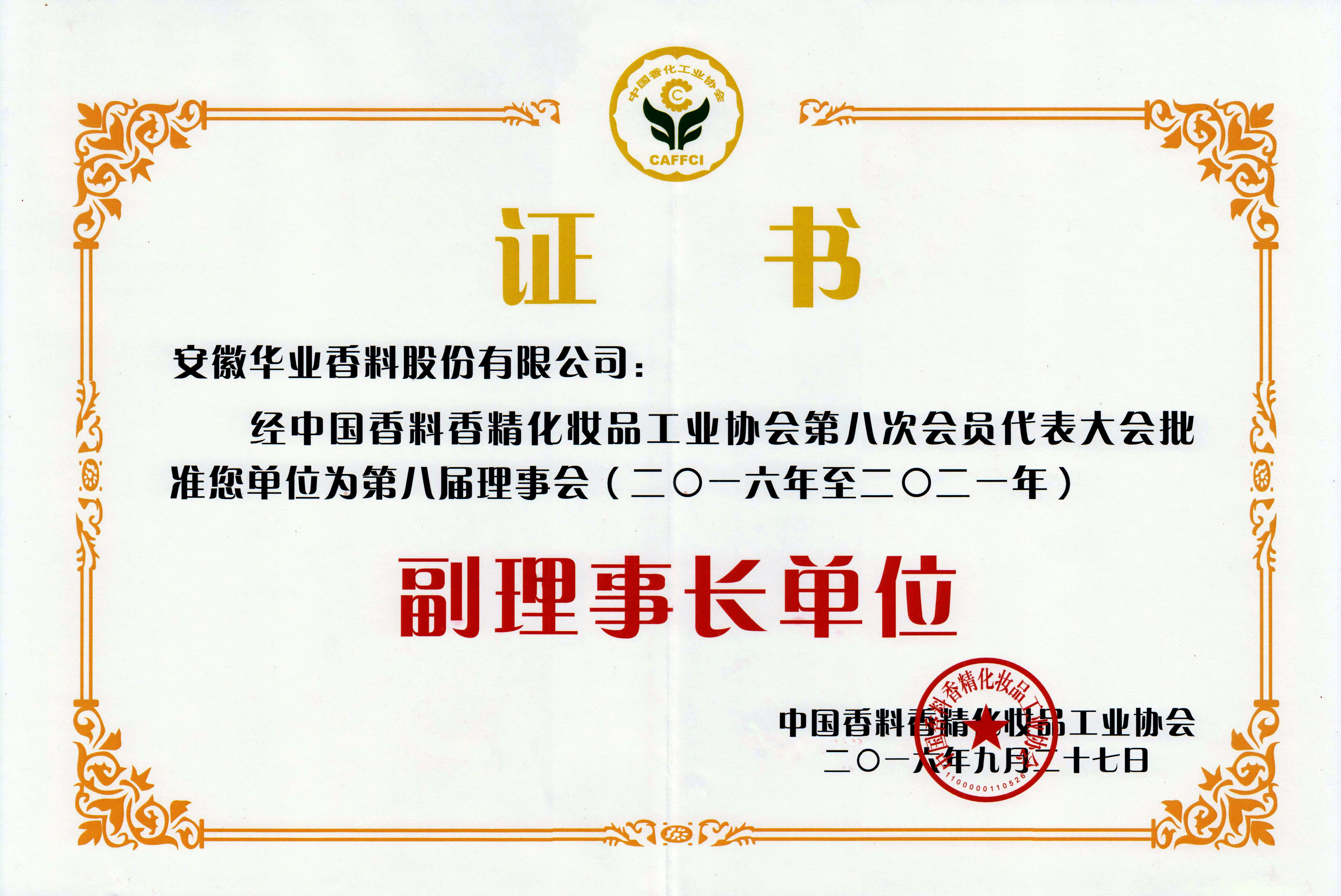 2016年當選中國香料香精化妝品工業協會副理事長單位