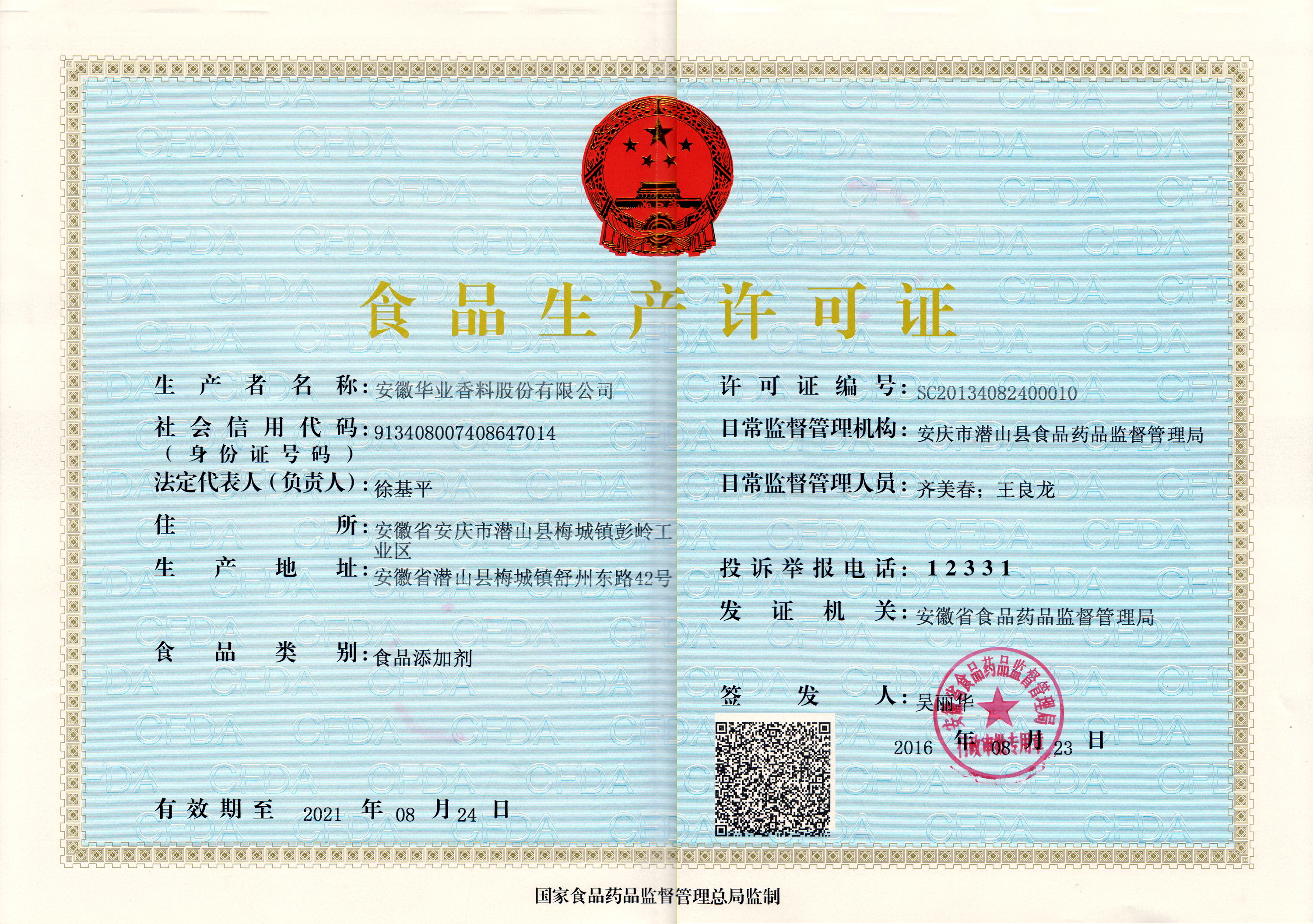 2016年取得《食品生產許可證》
