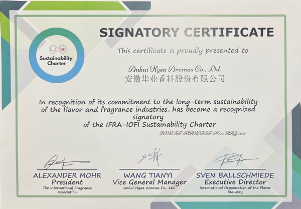 2025年5月13日,由中國香料香精化妝品工業協會(簡稱:中國香妝協會,CAFFCI)與國際日用香料協會(IFRA)、國際食品用香料工業組織(IOFI)共同主辦的國際香料香精可持續發展研討會,在上海成功舉行。在此次會議上,包含華業香料在內的四家中國企業共同加入《IFRA-IOFI聯合可持續章程》,實現了中國香料香精行業企業在成功加入IFRA-IOFI聯合可持續章程方面“零的突破”。